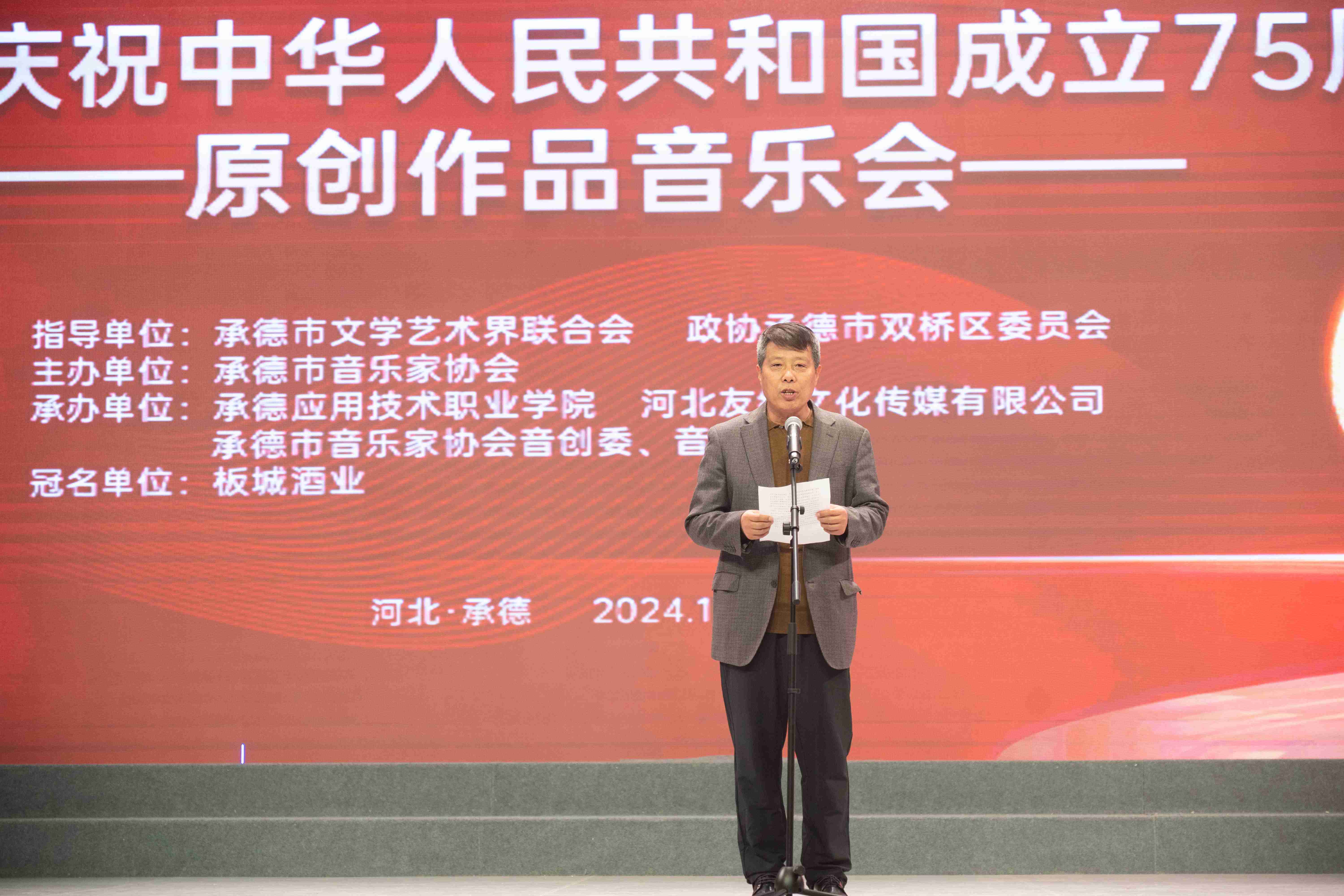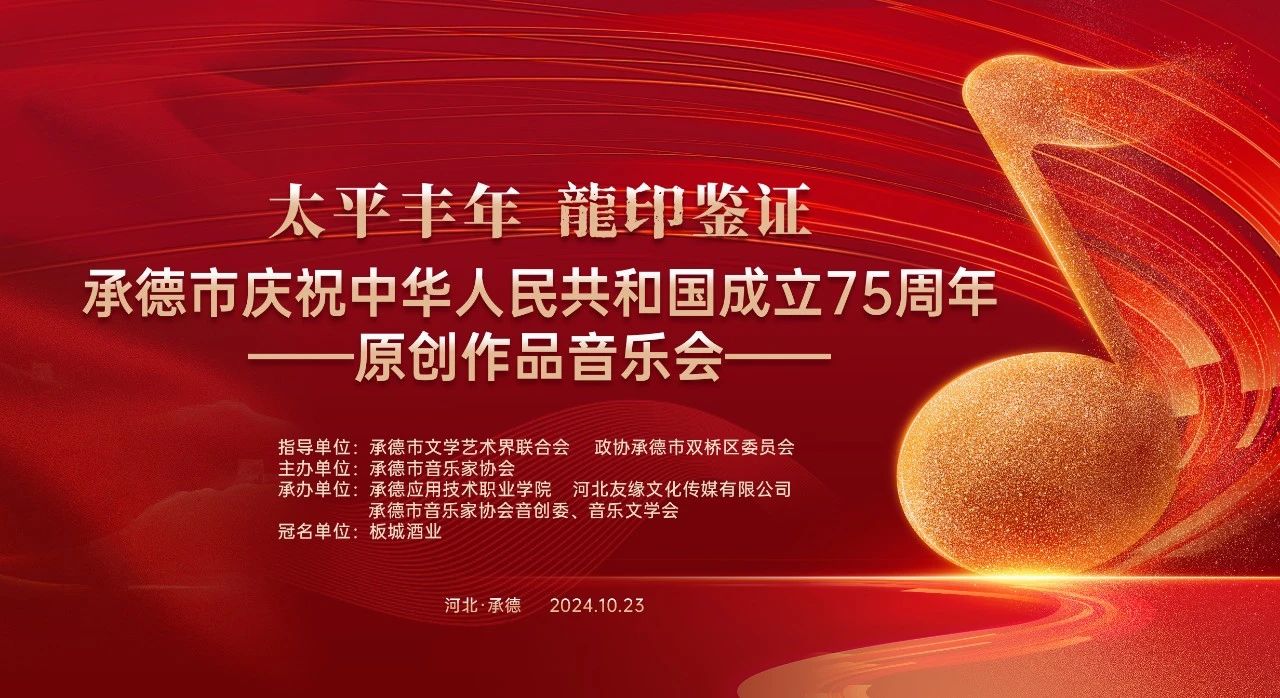 謳歌新時代、禮贊新中國;10月23日,為慶祝中華人民共和國75周年華誕,板城酒業(yè)聯(lián)合承德市音樂家協(xié)會舉辦“太平豐年、龍印鑒證——承德市慶祝中華人民共和國成立75周年原創(chuàng)作品音樂會”,用音樂歌頌偉大的祖國和偉大的黨。