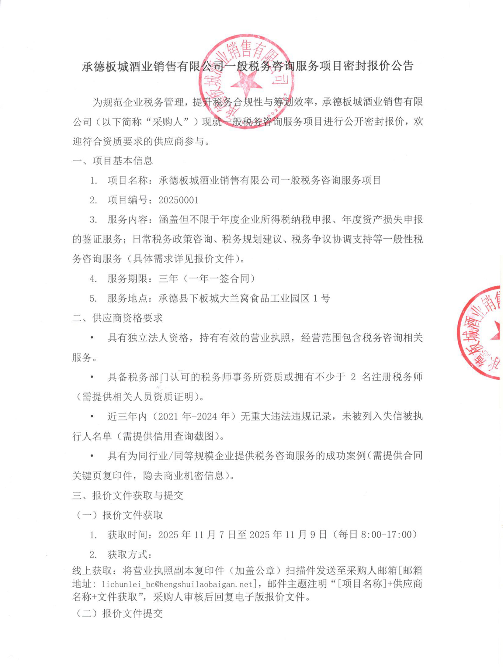 承德板城酒業(yè)銷售有限公司一般稅務(wù)咨詢服務(wù)項(xiàng)目密封報(bào)價(jià)公告